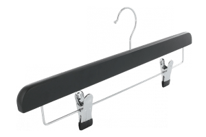 Cintre bois plat sans barre, avec finition laqué noir mat et crochet nickelé H59